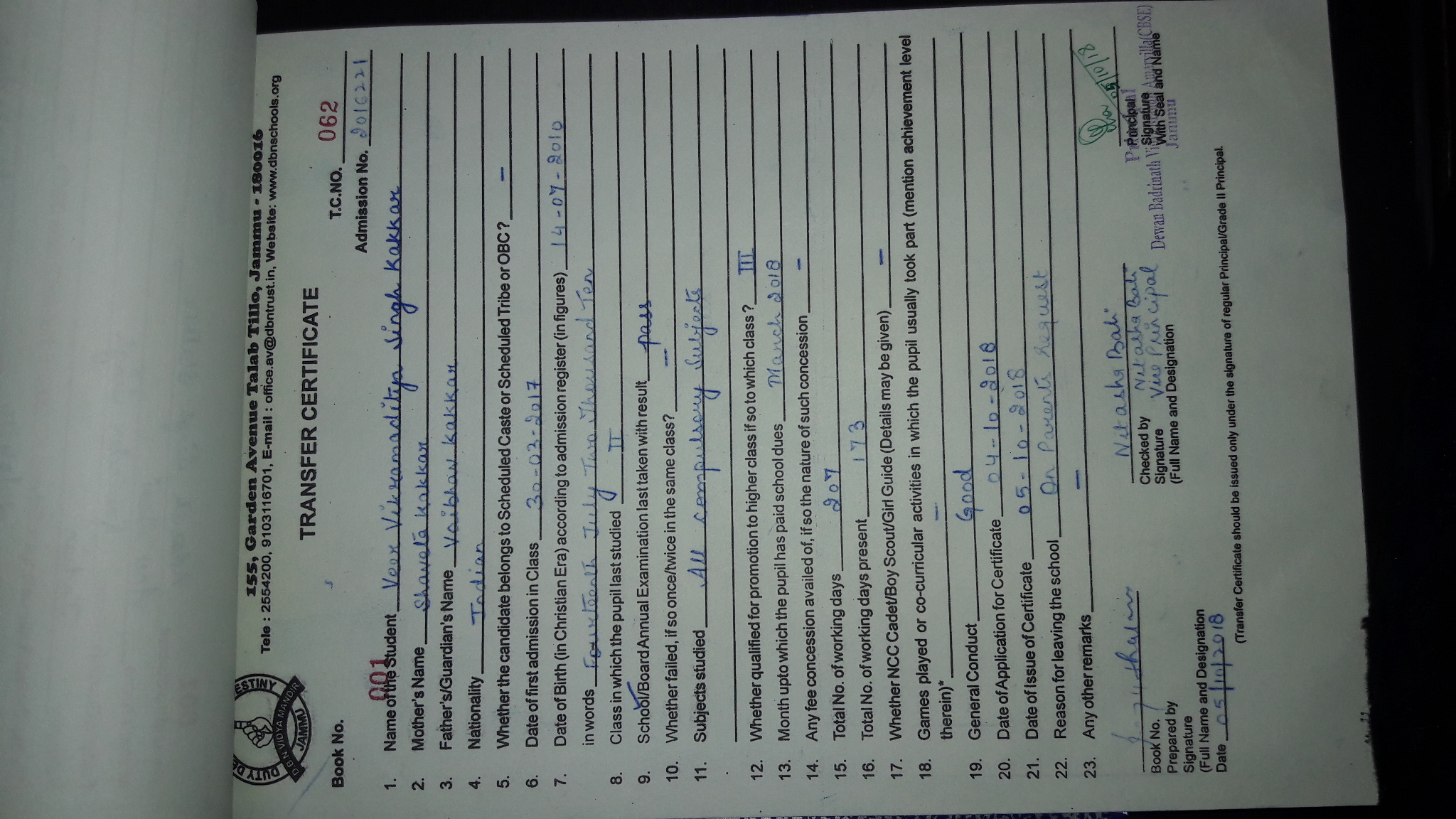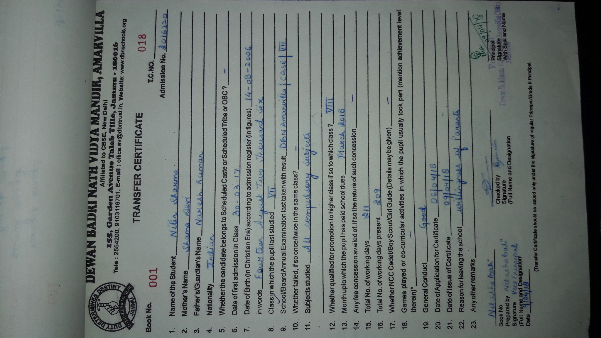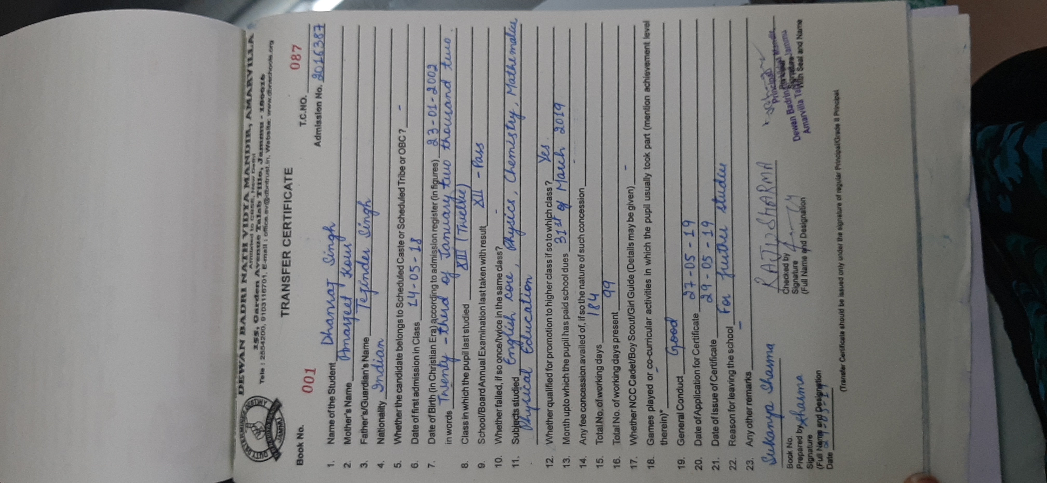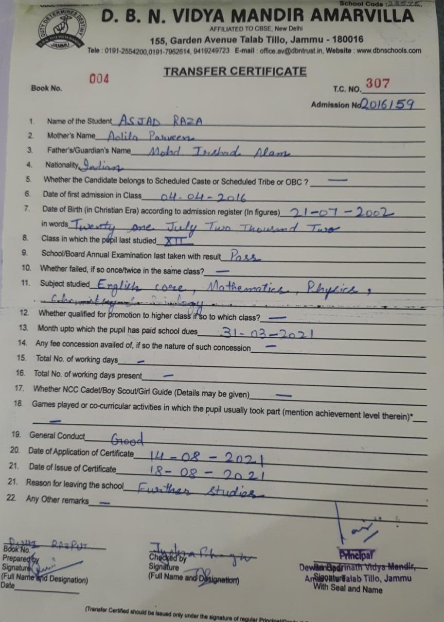| 2016169 | Tanveer Jamwal | 11/10/2008 | Shifting to another school | Downlaod |